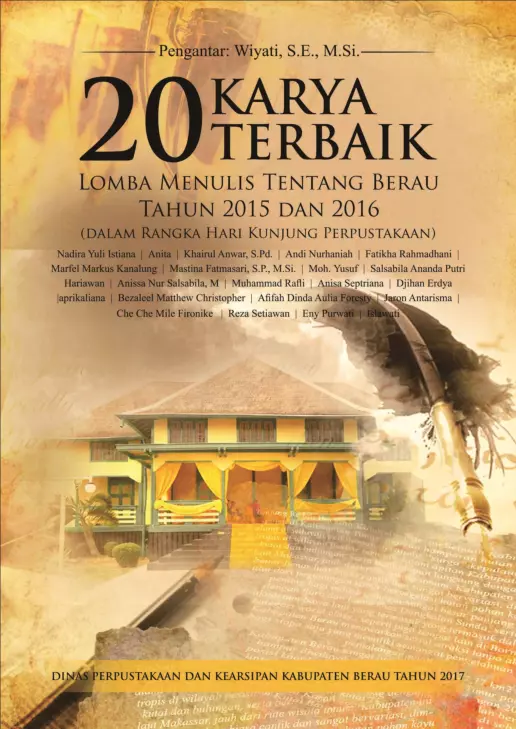 Buku ini terdiri dari 20 judul Berikut salah satu kutipan tulisan tentang Berau SURGA DI TIMUR LAUT KALIMANTAN Karya Nadira Yuni Istiana Kabupaten Berau adalah sebuah daerah yang terletak di sebelah utara pulau Kalimantan yang memiliki luas wilayah 34 127 47 km2 dengan penduduk lebih dari 179 079 jiwa Kabupaten Berau merupakan salah satu pintu gerbang pembangunan di wilayah provinsi Kalimantan Timur bagian utara dan sekaligus merupakan wilayah daratan dan Pesisir Pantai yang memiliki Sumber Daya Alam yang melimpah di mana wilayah daratan terdiri dari gugusan bukit yang terdapat hampir disemua kecamatan terutama Kecamatan Kelay yang mempunyai perbukitan Batu Kapur yang luasnya hampir 100 km2 Sementara didaerah Kecamatan Tubaan Terdapat perbukitan yang dikenal dengan Bukit Padai Mungkin sebagian orang masih banyak yang belum mengenal Kabupaten Berau Tidak sedikit yang mengatakan bahwa Berau adalah Surga ditimur laut Kalimantan Kondisi Alam Kabupaten Berau juga masih sangat asli Disetiap jalannya masih banyak kita jumpai pepohonan besar dan rindang yang usianya tidak muda lagi dan juga di dalam hutannya masih terdapat binatang binatang khas kalimantan seperti Bekantan atau lebih di kenal dengan monyet berhidung panjang Selain macam macam fauna yang terdapat di dalam hutan konon di pedalaman hutan yang jarang terjangkau oleh manusia masih terdapat orang orang primitif yang belum tersentuh oleh pengaruh modernisasi Orang orang ini biasanya bersembunyi dibalik pohon pohon ketika ada orang asing yang mendekati wilayahnya Pembangunan di Kabupaten Berau juga mengalami perkembangan yang cukup signifikan Setiap tahunnya Kabupaten Berau selalu memiliki perubahan perubahan yang cukup baik Seperti dalam bidang pendidikan daerah ini sudah dapat bersaing dengan daerah daerah lainya di tingkat nasional maupun internasional Hal ini di buktikan dengan diraihya beberapa medali di olimpiade olimpiade nasional maupun internasional