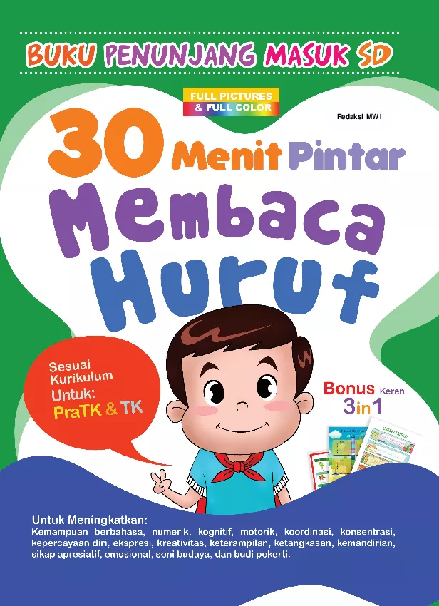 Buku 30 Menit Pintar Membaca Huruf ini dibuat khusus oleh para pakar pendidikan anak sebagai sarana atau penunjang yang diperuntukkan kepada anak anak PAUD PRA TK dan TK dalam rangka persiapan masuk Sekolah Dasar SD yang mencakup semua aspek dalam pengembangan diri maupun kemampuan pokok yang harus dimiliki oleh setiap anak yang disesuaikan dengan tumbuh kembang dan daya tangkap anak dalam usia keemasannya dimana waktu efektif dan terbaik belajar seorang anak berkisar 30 menit sehingga semua materi yang disampaikan dapat diterima dengan mudah dan dicerna secara sempurna
