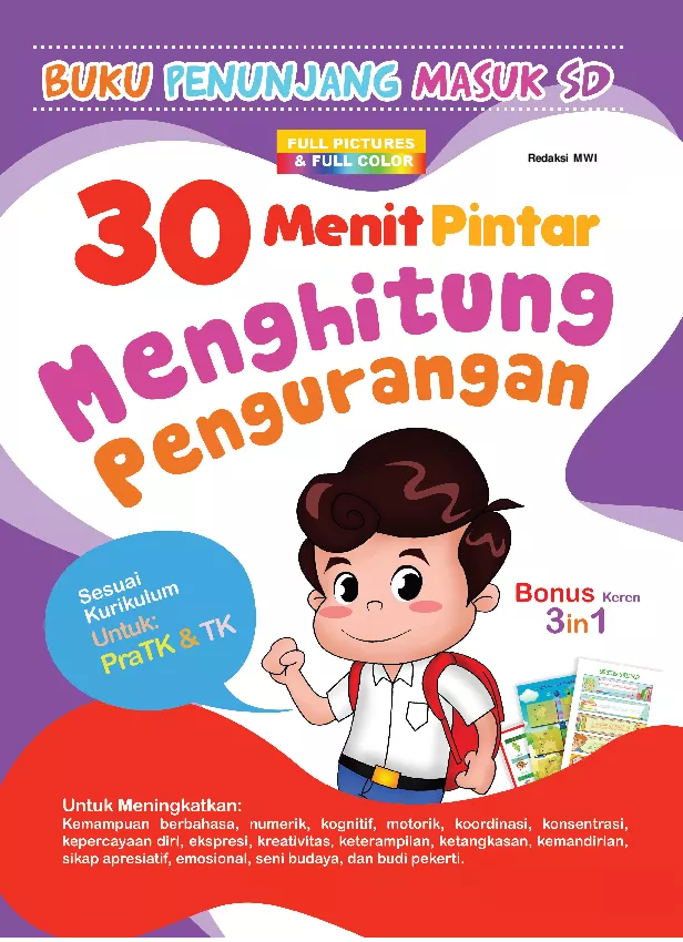 Buku 30 Menit Pintar Menghitung Pengurangan ini dibuat khusus oleh para pakar pendidikan anak sebagai sarana atau penunjang yang diperuntukkan kepada anak anak PAUD PRA TK dan TK dalam rangka persiapan masuk Sekolah Dasar SD yang mencakup semua aspek dalam pengembangan diri maupun kemampuan pokok yang harus dimiliki oleh setiap anak yang disesuaikan dengan tumbuh kembang dan daya tangkap anak dalam usia keemasannya dimana waktu efektif dan terbaik belajar seorang anak berkisar 30 menit sehingga semua materi yang disampaikan dapat diterima dengan mudah dan dicerna secara sempurna