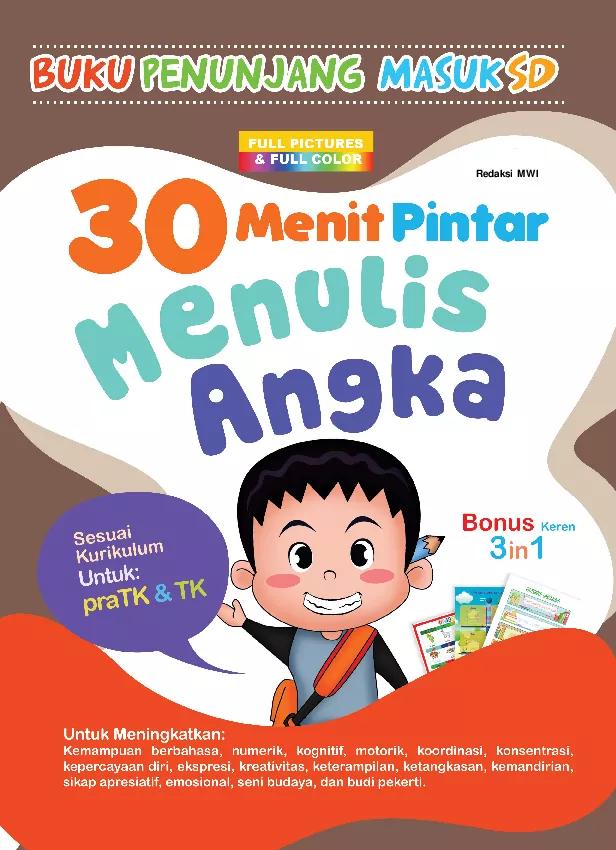 Buku 30 Menit Pintar Menulis Angka ini dibuat khusus oleh para pakar pendidikan anak sebagai sarana atau penunjang yang diperuntukkan kepada anak anak PAUD PRA TK dan TK dalam rangka persiapan masuk Sekolah Dasar SD yang mencakup semua aspek dalam pengembangan diri maupun kemampuan pokok yang harus dimiliki oleh setiap anak yang disesuaikan dengan tumbuh kembang dan daya tangkap anak dalam usia keemasannya dimana waktu efektif dan terbaik belajar seorang anak berkisar 30 menit sehingga semua materi yang disampaikan dapat diterima dengan mudah dan dicerna secara sempurna
