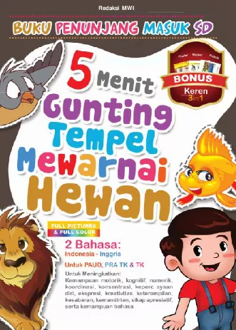Buku 5 Menit Gunting Tempel Mewarnai Hewan merupakan media yang paling tepat untuk menciptakan kecerdasan anak yang luar biasa Melalui aktivitas gunting tempel dan mewarnai maka kemampuan motorik kognitif numerik koordinasi konsentrasi kepercayaan diri ekspresi kreativitas keterampilan kesabaran kemandirian sikap apresiatif serta kemampuan berbahasa anak dapat berkembang dengan baik dan tepat sasaran di usia keemasannya