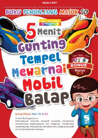 Buku 5 Menit Gunting Tempel Mewarnai Mobil Balap merupakan media yang paling tepat untuk menciptakan kecerdasan anak yang luar biasa Melalui aktivitas gunting tempel dan mewarnai maka kemampuan motorik kognitif numerik koordinasi konsentrasi kepercayaan diri ekspresi kreativitas keterampilan kesabaran kemandirian sikap apresiatif serta kemampuan berbahasa anak dapat berkembang dengan baik dan tepat sasaran di usia keemasannya