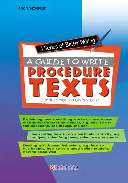 Writing adalah salah satu skill dalam bahasa Inggris Apakah kamu telah menguasai keterampilan itu Kalau sudah tentunya kamu juga telah mengenal jenis teks prosedur procedure text Menurutmu mudahkah mempelajari jenis teks ini Lalu bisakah kamu menulis teks berbentuk prosedur ini Sebagian mungkin menjawab ya dan sebagian lagi tidak Nah bagi kamu yang belum paham atau yang ingin memperdalam lagi pengetahuan tentang procedure text baca dan pelajari buku ini Dalam buku ini kamu akan menemukan banyak hal antara lain penjelasan tentang procedure text dan karakteristiknya struktur teks dan ciri ciri kebahasaannya serta macam macam procedure texts lengkap dengan contoh teksnya Terlebih lagi contoh procedure texts tersebut juga dilengkapi dengan gambar gambar yang menjelaskan langkah langkah dalam teks itu Tujuannya supaya kamu mudah memahami isi teks Selain itu buku ini juga memberikan penjelasan singkat tentang teknik penyusunan procedure text yang baik Di akhir buku kamu akan menemukan kegiatan berupa latihan yang membantu kamu mempraktikkan keterampilan menulis teks ini