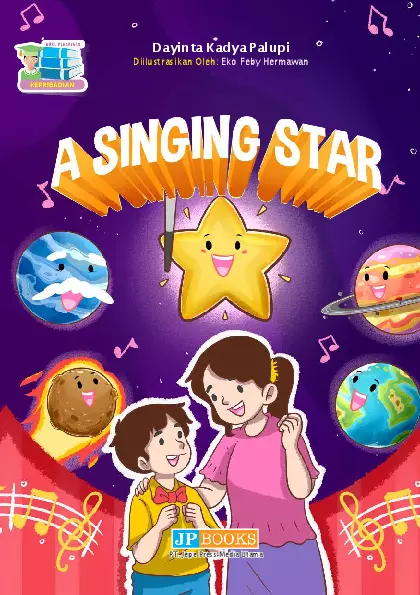 Sinopsis Buku: Di tengah alam semesta yang penuh dengan keajaiban, terdapat seorang bintang bernama *The Singing Star* yang dikenal dengan suaranya yang indah dan kemampuannya dalam mengajarkan musik kepada para benda langit lainnya. Ia dengan penuh semangat mengajarkan lagu dan melodi kepada para bintang, bulan, dan komet, bahkan sampai mengajarkan *beat box* kepada planet lama. Namun, kegigihan dan ambisi yang berlebihan membuatnya lupa untuk merawat diri. Ia terus bekerja tanpa henti hingga akhirnya kelelahan dan kehilangan suaranya. Kegagalan ini membuatnya sangat sedih dan menyesal. Namun, para teman-temannya, yaitu *The Old Planet*, *The Comet*, dan para bintang lainnya, tidak menyerah. Mereka membuat sebuah pertunjukan yang luar biasa untuk menghibur *The Singing Star*. Dengan lagu dan tarian yang indah, mereka membuktikan bahwa kegagalan bukan akhir dari segalanya. *The Singing Star* kembali tersenyum dan memahami bahwa keberhasilan tidak selalu tergantung pada kesempurnaan, tetapi pada tekad dan semangat untuk terus belajar dan berusaha. Buku ini mengajarkan pesan penting tentang ketekunan, kegigihan, dan pentingnya menjaga keseimbangan dalam hidup.