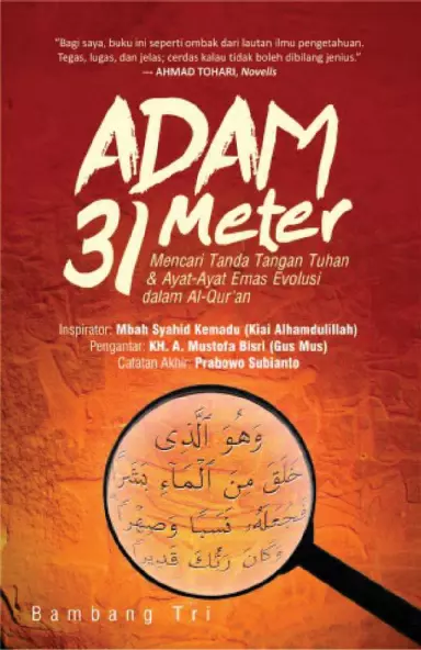 Sinopsis Buku: Buku ini menggambarkan perjalanan pencarian tanda tangan Tuhan dalam alam semesta, khususnya melalui perspektif evolusi manusia dan keterkaitannya dengan ajaran Al-Qur’an. Penulis, Bambang Tri, menggabungkan informasi ilmiah, kajian agama, dan kutipan dari tokoh-tokoh seperti Mbah Syahid Kemadu, Gus Dur, Harun Yahya, Charles Darwin, dan Pierre Paul Grasse. Buku ini membahas topik seperti ukuran tubuh Nabi Adam a.s. yang diduga mencapai 31 meter, evolusi manusia purba, mekanisme penambahan gen baru, serta kritik terhadap teori evolusi sintetik. Selain itu, buku ini juga mengupas mitos-mitos seputar sejarah dan kekhalifan Fir’aun, serta menguraikan ayat-ayat emas dalam Al-Qur’an yang berkaitan dengan perjalanan evolusi manusia. Buku ini menjadi referensi yang unik dan menarik bagi pembaca yang ingin memahami hubungan antara ilmu pengetahuan dan ajaran agama.