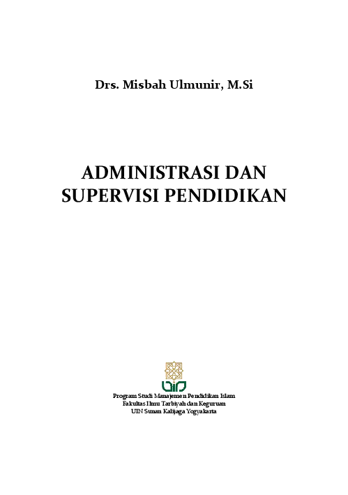 Sinopsis Buku: Buku *Administrasi dan Supervisi Pendidikan* ini merupakan karya Drs. Misbah Ulmunir, M.Si, yang diterbitkan oleh Program Studi Manajemen Pendidikan Islam (MPI) Fakultas Ilmu Tarbiyah dan Keguruan UIN Sunan Kalijaga Yogyakarta. Buku ini bertujuan untuk memberikan pemahaman mendalam mengenai konsep, ruang lingkup, fungsi, dan praktik pelaksanaan administrasi pendidikan serta supervisi pendidikan dalam konteks sekolah formal. Buku ini terdiri dari dua bagian utama. Bagian pertama membahas *Administrasi Pendidikan*, yang mencakup pengertian, ruang lingkup, dan fungsi administrasi pendidikan, serta meliputi beberapa subtopik seperti administrasi tata laksana sekolah, administrasi guru dan pegawai, supervisi pendidikan, pelaksanaan dan pembinaan kurikulum, serta hubungan sekolah dengan masyarakat. Bagian kedua fokus pada *Administrasi Pendidikan di Sekolah Formal*, yang meliputi administrasi sarana prasarana pendidikan, administrasi pembiayaan pendidikan, serta administrasi ketatalaksanaan pendidikan. Selain itu, buku ini juga menyertakan informasi mengenai peraturan perundang-undangan terkait hak cipta, yang menjelaskan perlindungan terhadap karya cipta dan sanksi yang berlaku jika terjadi pelanggaran. Buku ini sangat relevan bagi para pendidik, pengelola sekolah, mahasiswa, dan calon guru yang ingin memperdalam pengetahuan tentang manajemen dan pengelolaan pendidikan secara profesional dan berbasis bukti.
