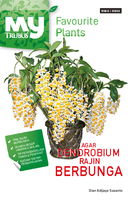 Dendrobium merupakan primadona anggrek Corak unik warna atraktif bentuk beragam dan maraknya bunga menjadi daya tarik tanaman kerabat vanili itu Apa lagi kini varian dendrobium semakin beragam ada yang berukuran pendek dan tinggi Bahkan kini hadir dendrobium berpenampilan bak phalaenopsis Selain berisi ragam jenis dendrobium buku ini juga memaparkan pemanfaatan dendrobium di segala bidang seiring dengan perubahan gaya hidup cara deteksi serta pengendalian hama dan penyakit cara menghasilkan anggrek berpenampilan prima serta trik agar dendrobium rajin berbunga