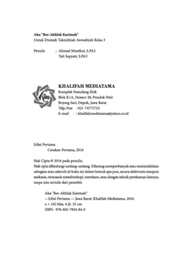 Sinopsis Buku Aku Ber-Akhlak Karimah untuk Diniyah Takmiliyah Awwaliyah Kelas 3 Buku *Aku Ber-Akhlak Karimah* adalah buku pelajaran yang dirancang untuk siswa kelas 3 Madrasah Diniyah Takmiliyah Awwaliyah (MDT Awwaliyah). Buku ini dibuat berdasarkan Standar Kompetensi dan Kompetensi Dasar Kurikulum Nasional Kementerian Agama RI tahun 2013, sehingga relevan dan sesuai dengan kebutuhan pembelajaran di madrasah. Buku ini terdiri dari lima bab yang disusun dalam dua semester, dengan masing-masing bab dilengkapi ilustrasi gambar menarik, latihan soal, dan uji kompetensi untuk memperkaya pemahaman siswa. Buku ini bertujuan untuk membantu guru dan siswa dalam proses belajar-mengajar, khususnya dalam memahami dan menerapkan akhlak mahmudah dalam kehidupan sehari-hari. Bab-bab yang disajikan meliputi: 1. Akhlak Mahmudah – menjelaskan pengertian akhlak mahmudah, serta tiga sifat utama dalam akhlak, yaitu syukur, sabar, dan ikhlas. 2. Akhlak Mahmudah dalam Kehidupan Sehari-hari kepada Diri Sendiri – memperkenalkan dua nilai akhlak lainnya, yaitu qana’ah (memuji keadaan) dan tawadhu’ (sikap rendah hati). 3. Syaja’ah – yang merupakan nilai akhlak yang terakhir dalam buku ini, menjelaskan pengertian dan dalil-dalil yang mendukungnya. Setiap bab dilengkapi dengan kisah teladan, dalil naqli (ayat Al-Qur’an dan hadis), rangkuman, dan evaluasi untuk memastikan pemahaman siswa. Buku ini tidak hanya memberikan pengetahuan tentang akhlak, tetapi juga mendorong praktik langsung dalam kehidupan sehari-hari, sehingga membentuk kepribadian yang berakhlak karimah dan beriman kepada Allah SWT. Dengan struktur yang jelas dan penyajian yang menarik, *Aku Ber-Akhlak Karimah* menjadi panduan yang bermanfaat untuk meningkatkan kualitas pendidikan karakter di lingkungan madrasah.