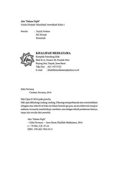 Sinopsis Buku: Buku *‘Aku \"Faham Figh’* ini merupakan buku ajar yang dirancang khusus untuk siswa Madrasah Diniyah Takmiliyah (MDT) Tingkat Awwaliyah (Kelas 1). Buku ini berisi materi pelajaran yang disusun sesuai dengan Standar Kompetensi dan Kompetensi Dasar yang berlaku, sehingga membantu siswa dalam memahami dan menguasai konsep-konsep dasar dalam bidang tata cara ibadah, khususnya dalam hal bersuci, wudhu, adzan, iqomah, dan shalat. Buku ini dibagi menjadi empat bab utama, yaitu: 1. Thoharoh (Bersuci) – membahas pengertian thoharoh, alat untuk bersuci, jenis-jenis air, hadats, najis, serta cara mensucikan diri. 2. Wudhu dan Tayamum – menjelaskan pengertian, syarat, rukun, sunah, doa setelah wudhu, hal yang membatalkan wudhu, serta cara melakukan tayamum. 3. Adzan dan Iqomah – memperkenalkan pengertian, syarat, sunah, dan bacaan adzan serta iqomah, termasuk doa setelah azan. 4. Shalat – menjelaskan pengertian shalat, bacaan-bacaan dalam shalat, serta pentingnya menjaga kebersihan dan kesucian dalam ibadah. Selain itu, buku ini juga dilengkapi dengan rangkuman materi di setiap bab, evaluasi, dan soal uji kompetensi semester untuk memudahkan siswa dalam menilai pemahaman mereka. Buku ini dirancang untuk menjadi panduan praktis dan mudah dipahami oleh siswa, sekaligus membantu guru dalam penyampaian materi pelajaran. Dengan materi yang disusun secara terstruktur dan jelas, buku ini membantu siswa dalam mempraktikkan ajaran Islam secara nyata, sebagaimana yang diajarkan oleh Nabi Muhammad saw, bahwa kebersihan adalah bagian dari iman.