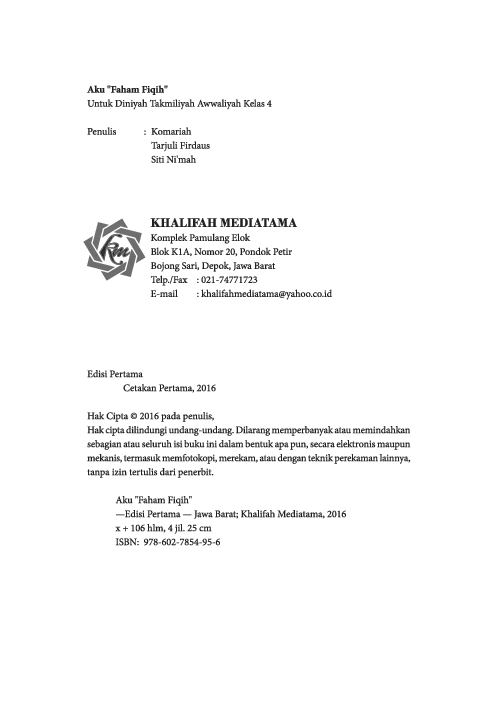 Sinopsis Buku: Buku *‘Aku \"Faham Figih’* merupakan buku pelajaran yang disusun khusus untuk siswa Madrasah Diniyah Takmiliyah Awwaliyah Kelas 4. Buku ini dirancang berdasarkan Standar Isi dan Kompetensi Dasar (SKKD) kurikulum Pendidikan Diniyah Takmiliyah tahun 2012 yang disahkan oleh Kementerian Agama Republik Indonesia. Buku ini bertujuan untuk membantu siswa memahami ajaran Islam secara mendalam, terutama mengenai ibadah haji, umrah, qurban, aqiqah, khitan, serta hal-hal terkait binatang halal dan haram. Materi dalam buku ini disusun secara terstruktur, meliputi penjelasan mengenai arti, hukum, waktu, dan syarat wajib haji, serta tujuan dan hikmah dari ibadah haji dan umrah. Selain itu, buku ini juga menjelaskan manasik haji dan umrah, serta memandu siswa untuk mempraktikkan secara langsung. Di bagian lain, buku ini membahas tentang qurban, aqiqah, dan khitan, termasuk pengertian, hukum, waktu, dan persyaratan pelaksanaannya. Selain itu, terdapat juga penjelasan mengenai binatang halal dan haram, serta cara menyembelih binatang yang benar sesuai dengan syariat Islam. Buku ini dilengkapi dengan latihan uji kompetensi yang direvisi tahun 2013, baik untuk tiap bab maupun semester, sehingga membantu siswa dalam menguasai materi pelajaran. Buku ini juga dilengkapi dengan rangkuman dan evaluasi untuk memperkuat pemahaman siswa. Dengan bahasa yang sederhana dan mudah dipahami, *‘Aku \"Faham Figih’* menjadi buku yang sangat bermanfaat bagi siswa, guru, dan masyarakat umum sebagai bahan ajar serta referensi dalam memahami ajaran Islam secara lebih mendalam.