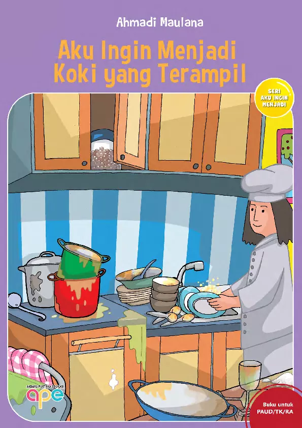 Sinopsis Buku: Buku ini berjudul *Aku Ingin Menjadi Koki yang Terampil* dan ditujukan untuk anak-anak usia dini (PAUD). Buku ini menggambarkan perjalanan seorang anak yang sangat tertarik pada dunia masakan dan ingin menjadi koki seperti Koki Diana. Melalui cerita yang menarik dan didukung gambar-gambar yang menggugah imajinasi, buku ini membawa pembaca mengenal kegiatan sehari-hari seorang koki, mulai dari bangun pagi, berbelanja ke pasar, hingga melakukan berbagai macam proses memasak di dapur. Dalam buku ini, anak akan belajar tentang berbagai bahan makanan, cara menata makanan, dan pentingnya memasak yang sehat serta bergizi. Selain itu, buku ini juga mengajarkan anak untuk memiliki semangat belajar dan berusaha agar bisa menjadi orang yang terampil, baik dalam hal memasak maupun dalam berbagai bidang lainnya. Buku ini tidak hanya menyenangkan, tetapi juga bermanfaat dalam membentuk kebiasaan membaca sejak dini dan memupuk minat anak terhadap dunia koki serta keterampilan memasak. Buku ini disusun dengan bahasa sederhana, mudah dipahami, dan dilengkapi dengan daftar kata untuk memperkaya kosakata anak.