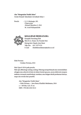 Sinopsis Singkat Buku “Aku Mengenal Tarikh Islam” Buku ini merupakan buku ajar yang dirancang untuk siswa Madrasah Diniyah Takmiliyah Tingkat Awwaliyah Kelas 1. Buku ini bertujuan untuk membantu siswa memahami sejarah para Nabi dan Rasul, serta mengenali mukjizat yang dianugerahkan oleh Allah kepada mereka. Buku ini disusun berdasarkan Standar Isi Kurikulum Madrasah Diniyah Takmiliyah yang dikeluarkan Kementerian Agama tahun 2013, sehingga memastikan materi yang disajikan relevan dan sesuai dengan kurikulum yang berlaku. Dalam buku ini, siswa akan mempelajari 25 Nabi dan Rasul yang wajib diimani, termasuk Nabi Nuh as, Nabi Hud as, Nabi Sholeh as, hingga Nabi Muhammad saw. Selain itu, buku ini juga menjelaskan mukjizat para Nabi dan Rasul Ulul Azmi, seperti mukjizat Nabi Ibrahim as, Nabi Musa as, Nabi Isa as, dan Nabi Muhammad saw. Materi ini disajikan secara sederhana dan menarik, sehingga mudah dipahami oleh siswa. Selain itu, buku ini juga menekankan pentingnya meneladani akhlak para Nabi dan Rasul, yang merupakan bagian dari pembentukan karakter dan nilai-nilai moral yang baik. Buku ini dilengkapi dengan rangkuman, evaluasi, dan soal uji kompetensi untuk memastikan pemahaman siswa terhadap materi yang dipelajari. Dengan penyusunan yang terstruktur dan penyajian yang mudah dipahami, buku ini menjadi sarana efektif untuk memperkaya pengetahuan sejarah Islam pada tingkat dasar.