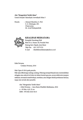 Sinopsis Buku “Aku Mengenal Tarikh Islam” untuk Diniyah Takmiliyah Awwaliyah Kelas 3 Buku ini merupakan buku ajar yang disusun khusus untuk siswa Diniyah Takmiliyah Tingkat Awwaliyah Kelas 3. Buku ini bertujuan untuk membantu siswa memahami sejarah perjalanan hidup Nabi Muhammad saw, khususnya dalam periode Mekkah dan Madinah, serta peristiwa penting dalam kehidupan beliau hingga akhir hayatnya. Buku ini disusun berdasarkan standar isi kurikulum Madrasah Diniyah Takmiliyah yang dikeluarkan Kementerian Agama tahun 2013, sehingga relevan dengan kebutuhan pembelajaran di tingkat tersebut. Buku ini terdiri dari beberapa bab yang membahas secara terstruktur dan sederhana tentang da’wah Nabi Muhammad saw di Mekkah, perjalanan dakwah di Madinah, perang-perang yang diikuti dan tidak diikuti Nabi, serta peristiwa penting seperti Fathu Makkah, Haji Wada’, dan wafat Nabi Muhammad saw. Selain itu, buku ini juga memperkenalkan konsep seperti sikap toleran terhadap perbedaan, cinta perdamaian, dan pentingnya bermusyawarah serta gotong royong dalam membangun masyarakat Islam. Dengan bahasa yang sederhana dan penyajian yang jelas, buku ini dirancang untuk memudahkan siswa, baik guru maupun murid, dalam memahami materi sejarah Islam yang penting dan relevan. Buku ini juga dilengkapi dengan rangkuman dan evaluasi di setiap bab untuk memperkuat pemahaman siswa. Dengan demikian, buku ini menjadi sumber belajar yang bermanfaat dalam membangun pengetahuan dan karakter siswa dalam konteks pendidikan Islam.