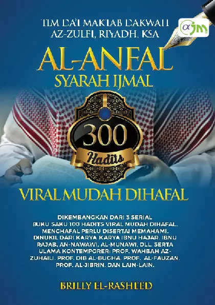 Sinopsis: Buku ini merupakan karya yang berjudul *Al-Anfal: Syarah Ijmal 300 Hadits Viral Mudah Dihafal*, yang ditulis oleh Tim Da'i Kantor Dakwah Kota Az-Zulfi dan Ust. H. Brilly El-Rasheed. Buku ini dirancang untuk memudahkan pembaca dalam menghafal dan memahami 300 hadits yang populer dan viral, yang telah dipilih secara selektif berdasarkan keshahihan dan relevansi dalam kehidupan sehari-hari. Buku ini tidak hanya menyajikan teks hadits, tetapi juga dilengkapi dengan syarah (penjelasan) yang ringkas dan jelas, sehingga memudahkan pembaca dalam memahami makna dan hukum dari setiap hadits. Pendekatan penulisan yang santun dan mudah dipahami membuat buku ini cocok untuk berbagai kalangan, termasuk pemula dalam belajar ilmu hadis. Selain itu, buku ini juga terinspirasi oleh dua judul kitab hadits yang terkenal, yaitu *Al-Lu`lu` wa Al-Marjan* dan *Jawahir Al-Bukhari*, yang dianggap memiliki judul yang indah dan menarik. Dalam upaya menciptakan judul yang serupa, penulis memilih nama-nama permata dalam bahasa Arab, seperti yaqut, zabarjad, zamrud, dan lainnya. Namun, karena tidak ada nama permata yang berakhiran “al” untuk menciptakan rima yang baik, penulis akhirnya memilih judul yang terkesan khas dan menarik, yaitu *Al-Anfal: Syarah Ijmal 300 Hadits Viral Mudah Dihafal*. Buku ini juga merupakan bagian dari upaya dakwah dan pendidikan Islam yang bertujuan untuk menyebarkan ilmu agama secara efektif dan menyenangkan. Dengan struktur yang terorganisir dan bahasa yang mudah dipahami, buku ini menjadi sarana yang efektif untuk memperkaya pengetahuan dan pemahaman tentang hadis dalam konteks kehidupan modern.