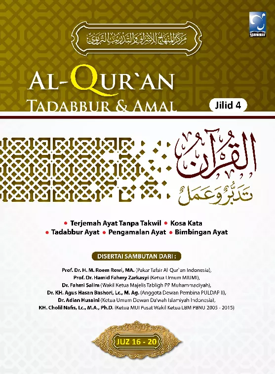 Berbagai tafsir dan kajian al Qur an itu tidak bisa dinikmati oleh cukup luas masyarakat Muslim Dari sini muncullah usaha berbagai pihak untuk menyederhanakan berbagai kajian al Qur an tersebut Salah satunya muncullah Al Qur an Tadabbur Amal jilid 4 ini yang merupakan uraian sederhana perenungan ayat demi ayat lalu merumuskan bimbingan pengamalan dari setiap ayat Artinya ilmu apa yang dapat kita pahami dari setiap ayat dan apa saja bentuk pengamalan darinya Dan semuanya merupakan penyederhanaan dari berbagai rujukan tafsir yang diterima di kalangan Ahlus Sunnah wal Jama ah Al Qur an Tadabbur Amal jilid 4 ini terdiri dari lima bagian pokok Mushaf al Qur an Kosa Kata Tadabbur Amal Pengamalan Ayat Bimbingan Ayat Demi lebih memudahkan pembaca tanah air memahami dan mengambil manfaat secara maksimal maka kami menyertakan bagian pokok keenam Terjemah al Qur an lengkap Semoga Allah menjadikan andil kami ini Pustaka Yassir dalam usaha mendekatkan pengkajian al Qur an kepada kaum Muslimin Indonesia sekalipun hanya berupa penerbitan terjemahannya sebagai amal kebajikan yang ikhlas karena ingin ridhaNya Mudah mudahan Allah berkenan menjadikan buku rujukan primer agar dikaji oleh seluas luasnya kaum Muslimin tanah air tercinta Amin