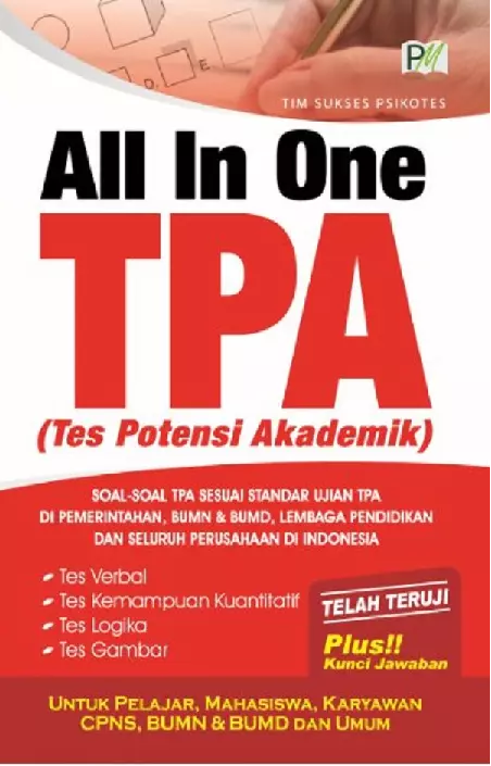 Sinopsis Buku: Buku ini merupakan kumpulan soal-soal Tes Potensi Akademik (TPA) yang dirancang secara komprehensif dan lengkap, cocok untuk para pelajar, mahasiswa, karyawan, calon pegawai negeri sipil (CPNS), serta masyarakat umum yang ingin mempersiapkan diri menghadapi berbagai jenis ujian TPA. Buku ini terdiri dari berbagai bab yang mencakup Tes Kemampuan Verbal, Tes Kemampuan Kuantitatif, Tes Logika, serta Tes Gambar, yang merupakan bagian utama dari penilaian TPA. Dalam Bab II, terdapat Tes Seri Huruf dan Tes Angka dalam Cerita, yang bertujuan mengukur kemampuan verbal dan kuantitatif peserta tes. Bab III fokus pada Tes Logika, yang meliputi Tes Penalaran Logis, Tes Penalaran Analitis, serta Tes Irama Gambar. Sementara itu, Bab IV berisi Tes Gambar yang mencakup Tes Klasifikasi Gambar, Tes Konsistensi Logis, Tes Pandang Ruang, dan Tes Potongan Gambar. Terdapat pula bab khusus mengenai Tes Volume Bangun dan Tes Potongan Gambar yang bertujuan menguji kemampuan spasial dan visual peserta tes. Selain itu, buku ini juga menyediakan kunci jawaban untuk memudahkan pembaca dalam mempelajari dan memahami materi yang disajikan. Buku ini sangat membantu bagi peserta tes yang ingin meningkatkan kemampuan dan memperoleh hasil maksimal dalam ujian TPA, baik untuk masuk perguruan tinggi, daftar CPNS, maupun perekrutan karyawan perusahaan dan lembaga pemerintahan. Dengan struktur yang jelas dan soal-soal yang relevan, buku ini menjadi panduan yang sangat bermanfaat bagi semua pelaku ujian TPA.