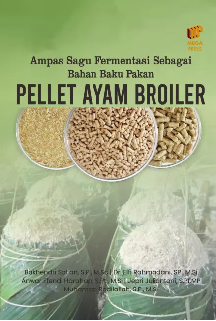 Ampas sagu adalah limbah tanaman yang diperoleh dari proses pengolahan batang sagu menjadi tepung sagu banyak dijumpai di daerah penghasil sagu terutama di Daerah Pesisir Provinsi Riau Selama ini limbah ampas sagu selalu dibuang begitu saja terutama pada aliran sungai sehingga selalu berpengaruh negatif terhadap kualitas lingkungan padahal limbah ampas sagu dapat dimanfaatkan sebagai pakan ternak dengan memperbaiki nilai nutrisinya dan selanjutnya didesain pakan bebentuk pellet Pakan pellet ini sesuai bila diberikan pada broiler dengan model formulasi campuran berbagai bahan baku basal Pakan pellet ampas sagu ini merupakan alternatif pilihan masyarakat terutama peternak kecil karena harga lebih murah dibandingkan pakan pabrikan yang relatif mahal sehingga mempengaruhi daya beli peternak dan ketidakefisienan dalam usaha pemeliharaan produksi dan bisnis brolier Oleh karena itu diperlukan informasi pengetahuan dan keterampilan bagi pembaca secara umum terutama peternak untuk mengoptimalisasi limbah ampas sagu sebagai pakan ternak melalui perbaikan nilai nutrisi dengan metode fermentasi anaerob silase yang selanjutnya dilakukan pengolahan mekanik dengan metode pellet sehingga layak dan bermanfaaat sebagai pakan unggulan broiler