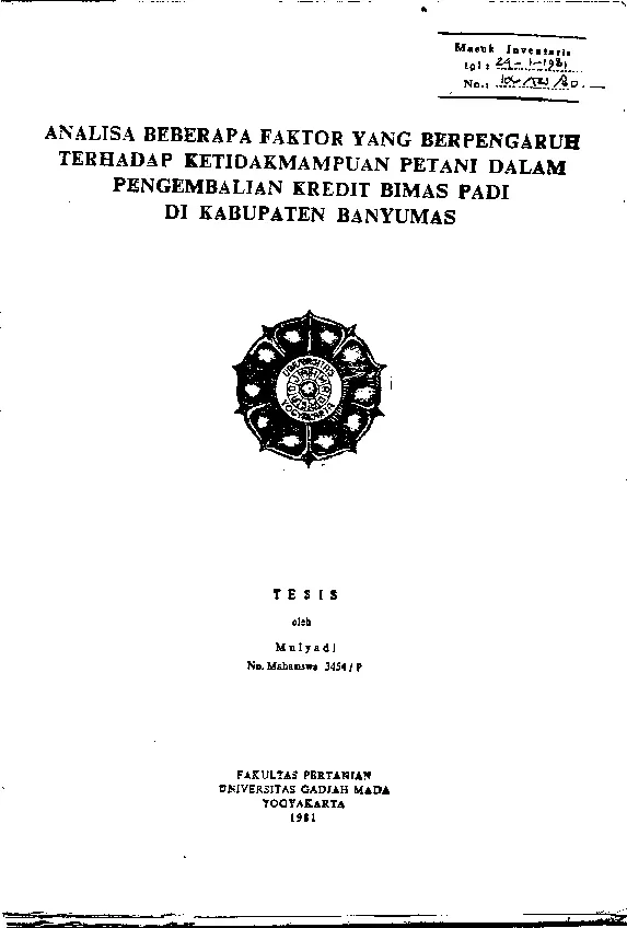 Analisa Beberapa Faktor Yang Berpengaruh Terhadap Ketidakmampuan Petani Dalam Pengembalian Kredit Bimas Padi Di Kabupaten Banyumas Mu Lyadi Fakultas Pertanian UGM Konten Lokal Konten Lokal 31355