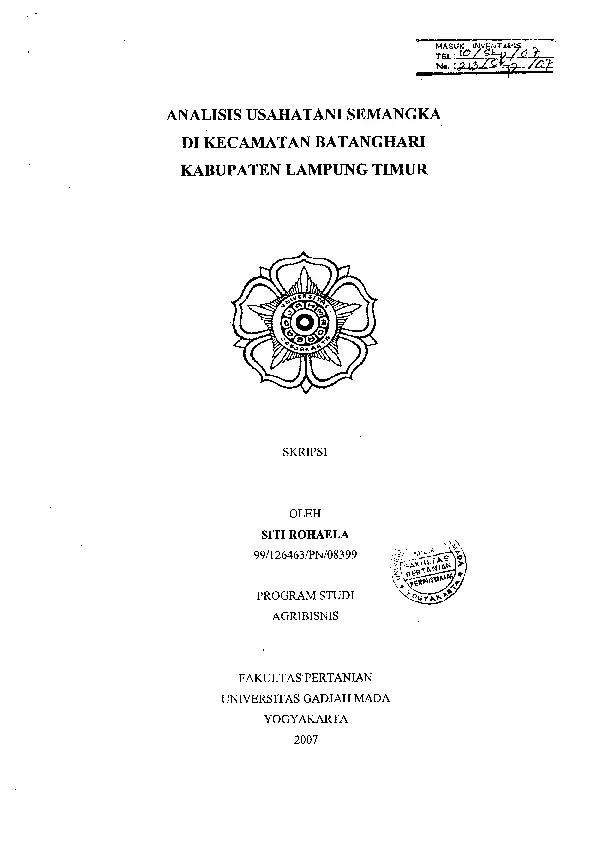 INTISARI ANALISIS USAHATANI SEMANGKA DI KECAMATAN BATANGHARI KABUPATEN LAMPUNG TIMUR SITIROHAELA 99 126463 PN 08399 Sarjana Pertanian Agustus 2007 Dibimbing oleh Dr Ir Slamet Hartono S U M Sc Penelitian ini bertujuan untuk mengetahui a alasan petani mengiisahakan semangka b titik impas usahatani semangka c kelayakan usahatani semangka dan d kontribusi pendapatan usahatani semangka terhadap pendapatan total petani Penelitian dilakukan di Kecamatan Batanghari Kabupaten Lampung Timur terhadap 40 orang responden Metode analisis yang digunakan adalah pengukuran kelayakan menggunakan parameter keuntungan R C ratio produktifitas tenaga kerja dan produktifitas modal perhitungan titik impas serta uji T untuk kontribusi pendapatan Hasil penelitian menunjukkan keuntungan petani lebih dari nol dan usahatani semangka berada di atas titik impas Hasil uji T menunjukkan bahwa usahatani semangka memberikan kontribusi yang besar pada taraf kepercayaan 95 Kesimpulan dari penelitian ini adalah usahatani semangka layak diusahakan dengan keuntungan Rp 8 901 413 per hektar R C ratio 1 95 produktifitas modal 76 13 per hektar per musim tanam produktifitas tenaga kerja Rp 122 216 HKO per hektar dan kontribusi pendapatan 86 48 terhadap pendapatan total petani Kata kunci usahatani semangka kelayakan titik impas kontribusi Pembimbing Utama Penulis Dr Ir SlMiet Hartono S U M Sc Siti Rohaela z jv T