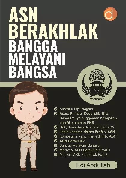 Buku Sosiologi dan Antropologi yang berjudul ASN Berakhlak Bangga Melayani Bangsa merupakan buku karya Edi Abdullah Buku ini akan menjadi core values bagi ASN untuk dijadikan pedoman dan menjadi standardisasi bagi semua aparatur sipil di negara ini untuk dijadikan panduan nilai dan budaya kerja dalam organisasinya yang dikenal dengan sebutan Berakhlak Bangga Melayani Buku ASN Berakhlak Bangga Melayani Bangsa ini membahas mengenai bagaimana jalan menuju ASN berakhlak yang merupakan penjabaran nilai dari 7 core values dari kumpulan Nilai Nilai Dasar Instansi Pemerintah yang terdiri dari 7 nilai yakni Berorientasi Pelayanan Akuntabel Kompeten Harmonis Loyal Adaptif dan Kolaboratif Buku ini juga membahas tentang kewajiban dan larangan ASN sebagaimana yang terdapat dalam Peraturan Pemerintah Republik Indonesia Nomor 94 Tahun 2021 tentang Disiplin Pegawai Negeri Sipil