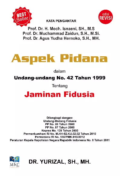 Sinopsis Singkat Buku "Aspek Pidana dalam Undang-Undang No. 42 Tahun 1999 tentang Jaminan Fidusia" Buku ini membahas secara mendalam aspek pidana dalam Undang-Undang Nomor 42 Tahun 1999 tentang Jaminan Fidusia. Penulis, DR. Yurizal, SH., MH., menjelaskan berbagai ketentuan hukum yang terkait dengan jaminan fidusia, termasuk aspek hukum pidana yang diatur dalam Pasal 72 Undang-Undang Hak Cipta dan berbagai peraturan turunan seperti PP No. 86 Tahun 2000, PP No. 87 Tahun 2000, serta Permenkumham RI No. M.HH-02.KU.02.02 Tahun 2010. Buku ini juga mencakup penjelasan mengenai perkembangan hukum fidusia, peran pihak-pihak dalam hubungan fidusia, serta pentingnya perlindungan hukum bagi pihak yang berkepentingan. Buku ini sangat relevan sebagai bahan bacaan bagi para dosen, praktisi hukum, dan mahasiswa yang ingin memahami lebih lanjut mengenai aspek pidana dalam jaminan fidusia.
