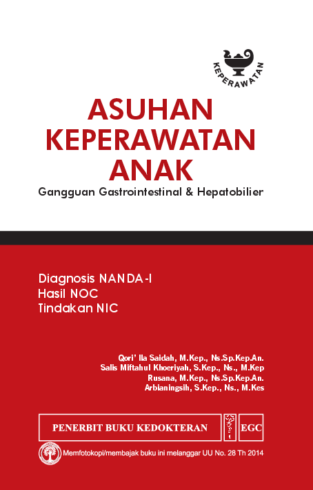 Buku Asuhan Keperawatan Anak Diagnosis NANDA I Hasil NOC Tindakan NIC terbagi menjadi 9 seri dan satu di antaranya adalah seri Gangguan Gastrointestinal Hepatobilier ini Buku ini mencakup informasi lengkap tentang gangguan gastrointestinal dan hepatobilier pada klien anak patofisiologi dan etiologinya Setiap gangguan yang dibahas dalam buku ini diuraikan secara alfabetis Buku ini juga mencakup bagian rencana asuhan keperawatan dari pengkajian fisik hingga pemeriksaan penunjang dan asuhan keperawatan Selain itu buku ini dilengkapi dengan diagnosis NANDA I hasil NOC dan tindakan NIC yang disajikan dalam bentuk tabel sehingga memudahkan pembaca memahami asuhan keperawatan untuk setiap gangguan pada klien anak Buku ini istimewa karena penyusunan dan penulisannya melibatkan beberapa dosen keperawatan anak dari beberapa institusi pendidikan keperawatan di Indonesia