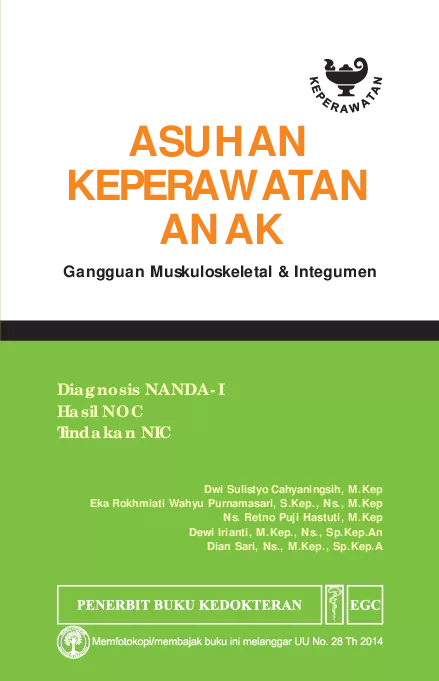 Buku Asuhan Keperawatan Anak Diagnosis NANDA I Hasil NOC Tindakan NIC terbagi menjadi 9 seri dan satu di antaranya adalah seri Gangguan Muskuloskeletal Integumen ini Buku ini mencakup informasi lengkap tentang gangguan muskuloskeletal dan integumen pada klien anak patofisiologi dan etiologinya Setiap gangguan yang dibahas dalam buku ini diuraikan secara alfabetis Buku ini juga mencakup bagian rencana asuhan keperawatan dari pengkajian fisik hingga pemeriksaan penunjang dan asuhan keperawatan Selain itu buku ini dilengkapi dengan diagnosis NANDA I hasil NOC dan tindakan NIC yang disajikan dalam bentuk tabel sehingga memudahkan pembaca memahami asuhan keperawatan untuk setiap gangguan pada klien anak Buku ini istimewa karena penyusunan dan penulisannya melibatkan beberapa dosen keperawatan anak dari beberapa institusi pendidikan keperawatan di Indonesia