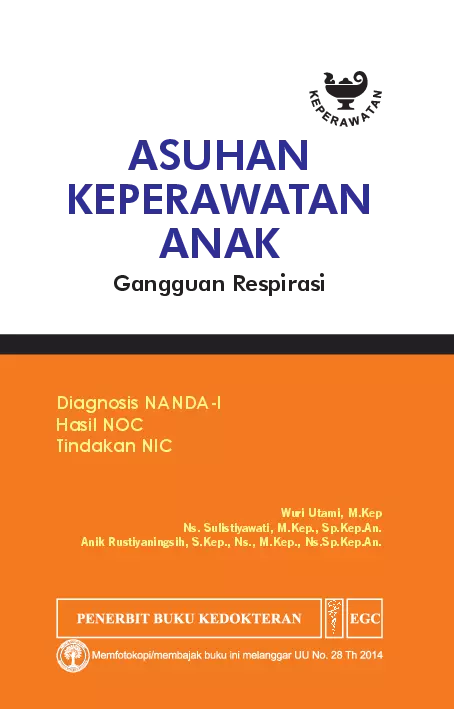 Buku Asuhan Keperawatan Anak Diagnosis NANDA I Hasil NOC Tindakan NIC terbagi menjadi 9 seri dan satu di antaranya adalah seri Gangguan Respirasi ini Buku ini mencakup informasi lengkap tentang gangguan respirasi pada klien anak patofisiologi dan etiologinya Setiap gangguan yang dibahas dalam buku ini diuraikan secara alfabetis Buku ini juga mencakup bagian rencana asuhan keperawatan dari pengkajian fisik hingga pemeriksaan penunjang dan asuhan keperawatan Selain itu buku ini dilengkapi dengan diagnosis NANDA I hasil NOC dan tindakan NIC yang disajikan dalam bentuk tabel sehingga memudahkan pembaca memahami asuhan keperawatan untuk setiap gangguan pada klien anak Buku ini istimewa karena penyusunan dan penulisannya melibatkan beberapa dosen keperawatan anak dari beberapa institusi pendidikan keperawatan di Indonesia