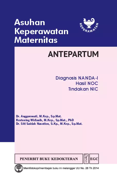 Asuhan Keperawatan Maternitas Diagnosis NANDA I Hasil NOC Tindakan NIC disusun untuk memudahkan mahasiswa mengakses informasi terkait maternitas sesuai kebutuhan Buku asuhan keperawatan maternitas ini terdiri atas tujuh seri Antepartum Kehamilan Risiko Tinggi Intrapartum Komplikasi Persalinan Pasca partum Bayi Baru Lahir Sistem Reproduksi dan Kesehatan Wanita Buku Antepartum ini mencakup pembahasan yang lengkap terkait kehamilan normal mulai dari tanda kehamilan perubahan pada ibu dan janin hingga keluhan yang muncul pada setiap trimester Buku ini dilengkapi rencana asuhan keperawatan yang mencakup pengkajian fisik riwayat kesehatan pemeriksaan laboratorium dan diagnostik serta asuhan keperawatan Asuhan keperawatan yang disajikan menggunakan diagnosis NANDA I hasil NOC dan tindakan NIC yang dikemas dalam bentuk tabel sehingga memudahkan pembaca memahami asuhan keperawatan untuk setiap gangguan yang dialami oleh ibu sepanjang masa kehamilannya