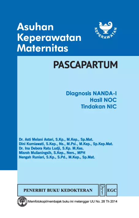 Buku Pascapartum ini mencakup pembahasan yang lengkap terkait uraian singkat tentang gangguan dampak gangguan terhadap kehamilan Buku ini dilengkapi rencana asuhan keperawatan dari pengkajian fisik riwayat kesehatan pemeriksaan laboratorium dan diagnostik serta asuhan keperawatan Asuhan keperawatan yang disajikan menggunakan diagnosis NANDA I hasil NOC dan tindakan NIC yang dikemas dalam bentuk tabel sehingga memudahkan pembaca memahami asuhan keperawatan untuk setiap gangguan yang dialami oleh ibu sepanjang masa kehamilannya