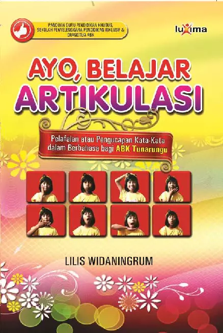 Keterbatasan kemampuan memberi bimbingan pembelajaran ran melatih berbicara anak tunarungu membuat guru atau orang tua anak tunarungu menjadi kurang optimal dalam melayaninya Sehingga kemampuan berbicara anak tunarungu pun sulit untuk berkembang Buku Ayo belajar artikulasi ini mengungkapkan bagaimana langkah langkah cara mengajar anak tunarungu untuk belajar artikulasi pelafalan atau pengucapan kata kata dalam berbahasa untuk anak tunarungu sedini mungkin Penyajiannya telah diusahakan secara praktis sehingga mudah dipahami dan dipelajari