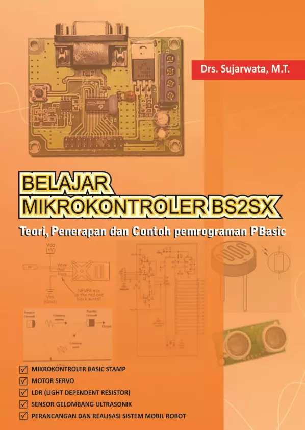 Sinopsis Buku: Buku ini membahas secara menyeluruh tentang mikrokontroler BS2SX dalam konteks teori, penerapan, dan contoh pemrograman menggunakan bahasa PBasic. Buku ini ditulis oleh Drs. Sujarwata, M.T. dan dirancang untuk membantu pembaca dalam memahami konsep-konsep dasar serta penerapan praktis mikrokontroler BS2SX dalam berbagai sistem elektronika dan otomasi. Isi buku mencakup spesifikasi mikrokontroler, cara pemrograman, koneksi pemrograman, serta berbagai aplikasi nyata dari mikrokontroler tersebut. Selain itu, buku ini juga menjelaskan tentang motor servo, termasuk bagian-bagian motor servo, tipe-tipe motor servo, serta konsep PWM (Pulse Width Modulation) yang digunakan untuk mengendalikan motor servo. Buku ini juga mengupas tentang sensor gelombang ultrasonik, termasuk prinsip kerja gelombang ultrasonik, jenis sensor, dan cara pengujian sensor tersebut dalam berbagai kondisi pengukuran. Buku ini juga menyajikan perancangan dan realisasi sistem mobil robot, termasuk peralatan yang digunakan dalam pembuatan mobil robot. Buku ini terstruktur secara praktis dan lengkap, sehingga dapat menjadi referensi yang bermanfaat bagi para siswa, mahasiswa, dosen, guru, serta praktisi industri dalam bidang teknik elektro dan elektronika. Buku ini juga menyajikan materi secara integratif antar disiplin ilmu, seperti elektronika analog, elektronika daya, teknik digital, dan pemrograman, sehingga membantu pembaca dalam mengembangkan keterampilan yang relevan.