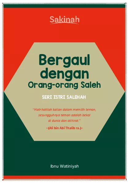 Istri yang salehah akan memperhatikan pergaulannya demi menjaga keharmonisan dan keutuhan rumah tangganya Kata Nabi Muhammad seseorang tergantung teman duduknya Jika temannya baik dia akan menjadi baik Sebaliknya jika teman dekatnya adalah orang orang yang buruk akhlak dan agamanya dia juga akan menjadi buruk Oleh karena itu pergaulan menjadi penting dalam menjaga keutuhan rumah tangga Istri yang salehah akan memprioritaskan bergaul dengan orang orang yang baik dan saleh Buku ini berisi gambaran singkat tentang sifat sifat istri salehah
