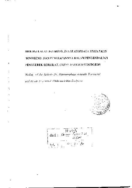 Biologi Lalat Jatiroto Diatraeophaga Striatalis Townsend Dan Penerapannya Dalam Pengendalian Penggerek Berkilat Chilo Auricilius Dudgeon Boedijono Wirioatmodjo Fakultas Pertanian UGM Konten Lokal Konten Lokal 48199