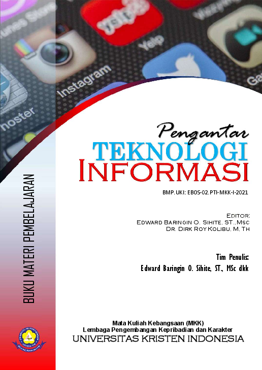 Buku Materi Pembelajaran MKK Pengantar Teknologi Informasi akan membantu dan memudahkan para mahasiswa untuk menguasai pengetahuan dasar tentang teknologi informasi BMP MKK Pengantar Teknologi Informasi dipelajari para mahasiswa meliputi definisi perangkat keras perangkat lunak untuk menjawab permasalahan sebagai user IT pada saat ini Para mahasiswa sebagai user IT dapat menduplikasikan pengetahuan IT kepada user IT di lingkungan kampus keluarga dan masyarakat di lingkungan para mahasiswa berada
