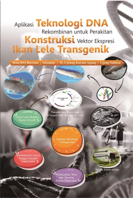 Sinopsis Buku Ajar: Aplikasi Teknologi DNA Rekombinan untuk Perakitan Konstruksi Vektor Ekspresi Ikan Lele Transgenik Buku ini membahas secara mendalam teknologi DNA rekombinan dan aplikasinya dalam pembuatan ikan lele transgenik, yang merupakan salah satu contoh penerapan bioteknologi dalam bidang pertanian dan budidaya ikan. Buku ini dibagi menjadi beberapa bab yang saling terkait, menggambarkan proses pengerjaan dari mulai isolasi dan identifikasi gen hingga perakitan vektor ekspresi dan pembuatan ikan transgenik. Bab I menjelaskan pentingnya bioteknologi dalam kehidupan manusia, terutama dalam memperbaiki fenotip pertumbuhan ikan, perbaikan genetik melalui rekayasa gen, serta struktur dan mekanisme replikasi DNA untuk sintesis protein. Bab ini juga menjelaskan dasar-dasar analisis sekuensing gen dan isolasi gen. Bab II berfokus pada teknik pemurnian dan isolasi fragmen DNA yang telah dikloning dalam vektor, dengan menggunakan kit komersial. Hasil sekuen gen yang telah dikloning dijabarkan untuk mengetahui kemiripannya dengan data bank gen online, sebagai konfirmasi kebenaran gen yang terisolasi. Bab III menjelaskan peran fungsional hormon pertumbuhan (GH) dan gen penyandi hormon tersebut. Daerah fungsional pada gen GH dijabarkan untuk desain primer gen penyandi, serta perbedaan kode nukleotida gen GH pada berbagai jenis ikan untuk mengetahui ukuran fragmen GH. Daerah pengapit (flanking sequence) juga dijelaskan untuk memahami daerah transkripsi pada proses amplifikasi gen. Bab IV menjelaskan prinsip teknik rekombinasi gen, yaitu penggabungan vektor ekspresi dengan gen yang akan disisipkan. Teknik ligasi digunakan sesuai protokol kit yang tersedia. Bab ini juga menjelaskan konfirmasi keberadaan sisipan gen pada vektor rekombinan setelah digesti vektor menggunakan enzim restriksi. Perbanyakan klon vektor ekspresi dilakukan melalui teknik ligasi-transformasi untuk memperjelas penggandaan gen secara in vivo dalam *E. coli*. Pembuatan vektor ekspresi rekombinan *pCMV-CgGH* dari gen GH lele (*CgGH*) dijelaskan secara rinci untuk pembuatan ikan lele transgenik. Buku ini merupakan sumber referensi yang komprehensif untuk memahami prinsip dan teknik dasar dalam teknologi transgenesis, khususnya dalam pembuatan ikan lele transgenik, yang menjadi contoh nyata penerapan bioteknologi dalam bidang pertanian dan kehidupan manusia.