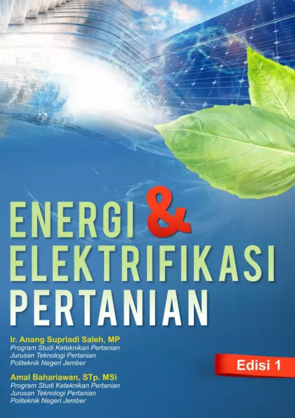 Buku ini berisi mengenai ruang lingkup energi dan elektrifikasi untuk kegiatan proses pertanian Energi dalam fisika merupakan properti fisika dari suatu objek dapat berpindah melalui interaksi fundamental yang dapat diubah bentuknya namun tak dapat diciptakan maupun dimusnahkan Joule adalah satuan SI untuk energi diambil dari jumlah yang diberikan pada suatu objek melalui kerja mekanik dengan memindahkannya sejauh 1 meter dengan gaya 1 newton Keberhasilan program penghematan energi tentu saja akan berdampak positif dalam proses penyediaan energi Potensi penghematan energi di industri misalnya berkisar antara 10 industri semen kapur batu bata keramik sampai dengan 35 industri kertas besi baja Penghematan ini bergantung pada i proses utama pembakaran peleburan pemanasan uap ii utilitas panas langsung mekanis panas uap iii alat dapur burner listrik diesel boiler burner iv teknik konservasi waste heat recovery perbaikan isolasi panas co generation