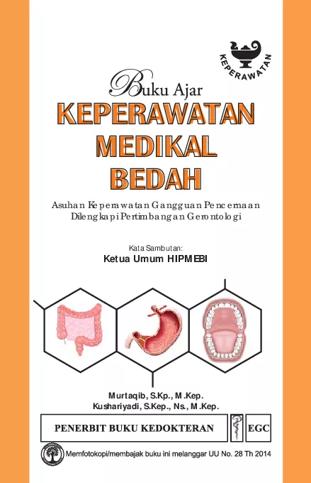 Sistem pencernaan terdiri atas sejumlah organ mulai dari mulut kerongkong lambung usus dan anus Sistem pencernaan berfungsi menerima dan mencerna makanan menjadi nutrisi yang dapat diserap Seiring dengan pertambahan usia banyak fungsi tubuh yang menurun tidak terkecuali pada saluran cerna Buku Ajar Keperawatan Medikal Bedah Asuhan Keperawatan Gangguan Pencernaan Dilengkapi Pertimbangan Gerontologi hadir untuk mengulik tentang gangguan saluran cerna pada lansia Seluk beluk saluran cerna gangguan saluran cerna yang dapat terjadi atau sering dijumpai di praktik klinik sehari hari dan aspek asuhan keperawatan yang dilakukan diuraikan dalam buku ini Satu yang membedakan buku ini dengan buku sejenis adalah pembahasan berbagai hal yang lazim dialami individu lansia terkait saluran cerna dan yang harus diperhatikan ketika menangani pasien lansia dengan gangguan cerna