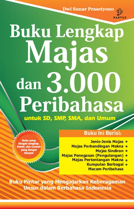 Tong kosong nyaring bunyinya Lain ladang lain belalang lain lubuk lain ikannya Tidak ada gading yang tak retak Anda tentu sering mendengar peribahasa peribahasa di atas Kata kata tersebut bukannya tanpa arti Dalam setiap peribahasa terkandung makna yang mendalam Di Indonesia ada banyak sekali peribahasa Pengen tahu lebih banyak tentang majas dan macam macam peribahasa Inilah buku yang tepat untuk Anda jadikan sebagai pedoman Buku ini berisi seabrek peribahasa sekaligus artinya Tidak ketinggalan pula penjelasan lengkap mengenai majas majas yang ada dalam sastra Indonesia Ayo jadilah bangsa yang mengerti tentang bahasanya sendiri bersama dengan buku ini