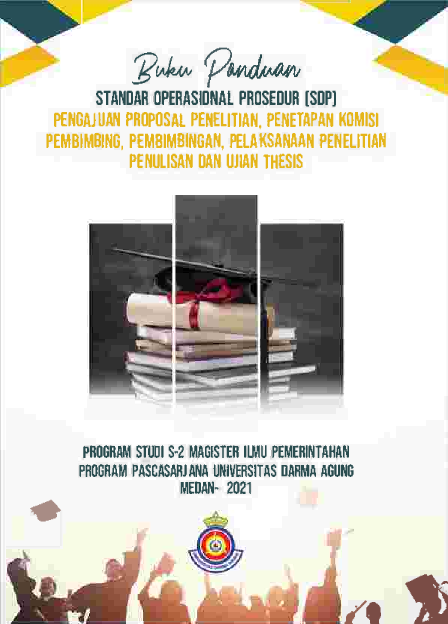 Buku SOP Pengajuan Proposal Penelitian Penetapan Komisi Pembimbing Pembimbingan Pelaksanaan Penelitian Penulisan dan Ujian Tesis Program Studi Magister Ilmu Pemerintahan Pasca Sarjana Universitas Darma Agung Medan Substansi materi buku ini mencakup ketentuan umum pengajuan proposal penelitian Tesis dan aturan aturan serta persyaratan yang harus dipenuhi oleh setiap mahasiswa Selain itu juga buku ini diharapkan dapat digunakan oleh para pembimbing untuk mengarahkan dan membimbing mahasiswa dalam mengefektifkan penyelesaian studi bimbingannya