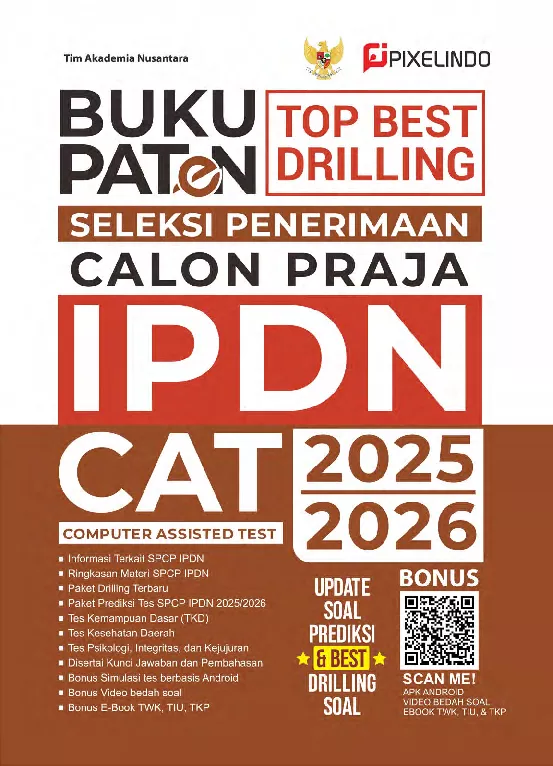 Salah satu tahapan seleksi masuk IPDN yang pertama adalah Seleksi Kompetensi Dasar Materi Tes SKD ini antara lain Tes Wawasan Kebangsaan Tes Intelegensi Umum dan Tes Karakteristik Pribadi Tes ini menentukan kelulusan teman teman dalam mengikuti tahapan seleksi selanjutnya Tentunya materi yang diujikan dalam tes ini tidak mudah maka dari itu kalian harus mempersiapkan diri sebaik mungkin agar lolos dalam seleksi penerimaan calon praja IPDN Buku Paten IPDN 2025 2026 hadir untuk menemani kalian berjuang menjadi calon praja IPDN Buku ini berisi penjelasan materi secara lengkap yang disertai dengan contoh soal Tak hanya itu buku ini juga dilengkapi dengan drilling soal serta paket prediksi yang disertai dengan kunci jawaban dan pembahasan yang detail serta logis Tak hanya tes SKD buku ini juga memuat penjelasan tahapan tes selanjutnya seperti tes psikologi tes integritas dan kejujuran serta tes kesehatan daerah