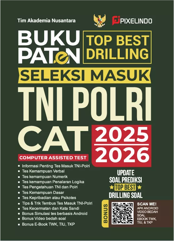 Beberapa tahapan seleksi masuk TNI dan Polri cukup beragam dan ketat Adapun tesnya meliputi tes administrasi tes kesehatan tes kesamaptaan fisik tes akademik tes psikologi tes kecermatan dan kata sandi serta tes pantukhir pantauan akhir Buku ini hadir untuk teman teman yang sedang mempersiapkan diri pada seleksi masuk TNI dan Polri tahun 2025 Di dalam buku ini terdapat beberapa keunggulan seperti penjelasan mengenai tahapan tahapan pendaftaran soal soal tes kecermatan dan kata sandi soal kemampuan numerik soal kemampuan penalaran logika dan gambar soal pengetahuan TNI dan Polri soal kemampuan dasar dan soal kepribadian psikotes Buku ini juga dilengkapi dengan kunci jawaban dan pembahasan yang lengkap Oleh karena itu Buku Paten Top Best Drilling Seleksi Masuk TNI POLRI 2025 2026 hadir untuk membantu teman teman yang ingin diterima sebagai calon anggota TNI dan POLRI Buku ini juga dilengkapi dengan simulasi tes yang bisa langsung dikerjakan di HP Android teman teman Adanya bantuan dari buku ini diharapkan kalian dapat belajar dengan tekun berlatih dengan rajin dan tetap semangat mengejar profesi TNI dan Polri