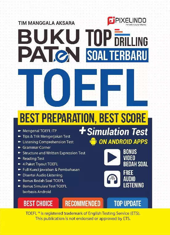 TOEFL ITP Institutional Testing Program merupakan ujian kemampuan bahasa Inggris yang sering digunakan sebagai persyaratan masuk perguruan tinggi program pascasarjana serta penempatan di berbagai lembaga pendidikan Memperoleh skor yang baik dalam TOEFL ITP adalah langkah penting bagi kesuksesan akademik dan karier kamu Buku ini dirancang khusus untuk membantu kamu mempersiapkan diri dengan baik untuk menghadapi ujian TOEFL ITP Kami telah mengumpulkan berbagai strategi tip dan latihan latihan yang dirancang secara khusus untuk membantu kamu meningkatkan keterampilan dalam setiap bagian tes TOEFL ITP mulai dari pemahaman mendengarkan hingga kemampuan menulis Dengan memanfaatkan buku ini secara optimal kami yakin kamu akan dapat meningkatkan kepercayaan diri dan mempersiapkan diri dengan baik untuk menghadapi ujian TOEFL ITP dengan hasil yang memuaskan