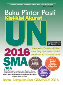 Sinopsis Buku Pintar Pasti Kisi-Kisi Akurat UN SMA/MA 2016 Buku ini merupakan panduan terpercaya bagi siswa SMA/MA yang sedang mempersiapkan diri menghadapi Ujian Nasional (UN) tahun 2016. Buku ini dirancang untuk membantu siswa memahami kisi-kisi soal yang akan keluar dalam ujian, sehingga memudahkan mereka dalam memfokuskan pembelajaran ke bagian-bagian yang relevan. Buku ini terdiri dari berbagai paket soal yang mencakup mata pelajaran utama seperti Bahasa Inggris, Bahasa Indonesia, Matematika, dan Tes Potensi Akademik (TPA). Setiap paket soal disusun secara terstruktur dan akurat, sesuai dengan standar kisi-kisi yang dikeluarkan oleh Dinas Pendidikan Nasional (DIKNAS). Selain itu, buku ini juga dilengkapi dengan contoh-contoh soal dan pembahasan yang memudahkan pemahaman siswa. Dengan memanfaatkan buku ini, siswa dapat meningkatkan kemampuan akademik mereka dan memperbesar peluang untuk lulus ujian dengan baik. Buku ini sangat cocok sebagai referensi utama dalam pembelajaran mandiri maupun untuk latihan ujian yang intensif.