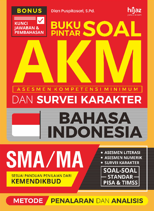 KATA PENGANTAR Puji syukur kami panjatkan ke hadirat Tuhan Yang Maha Esa karena berkat kehendak Nya kami dapat menyelesaikan Buku Pintar Soal AKM Asesmen Kompetensi Minimum dan Survei Karakter Bahasa Indonesia SMA MA Metode Penalaran dan Analisis Buku ini disusun sebagai buku pelengkap pelajaran di sekolah agar siswa lebih memahami konsep dasar AKM dan lebih terampil menyelesaikan soal soal teori maupun penalaran Asesmen Kompetensi Minimum AKM adalah kompetensi minimum yang dibutuhkan siswa untuk bisa belajar apapun mata pelajarannya AKM akan menguji kemampuan literasi dan numerasi siswa Literasi bukan sekadar kemampuan membaca tetapi juga kemampuan menganalisis suatu bacaan serta kemampuan untuk mengerti atau memahami konsep di balik bacaan tersebut Numerasi adalah kemampuan analisis menggunakan angka Pada AKM ditekankan kemampuan siswa dalam menggunakan konsep terkait untuk menganalisis sebuah materi Setelah siswa mempelajari buku Latihan Soal AKM ini kami berharap motivasi belajar siswa makin meningkat dan siswa dapat mengenal lebih dini tipe tipe soal AKM dan ujian ujian setara lainnya sehingga lebih siap untuk menghadapinya dan hasil yang akan diraih pun lebih optimal Akhirnya kami mengucapkan terima kasih sebesar besarnya kepada semua pihak yang telah memungkinkan buku ini dapat terbit Saran dan kritik yang bersifat konstruktif dari para pemakai buku ini sangat kami harapkan untuk perbaikan kualitas buku ini di masa mendatang Penulis 5