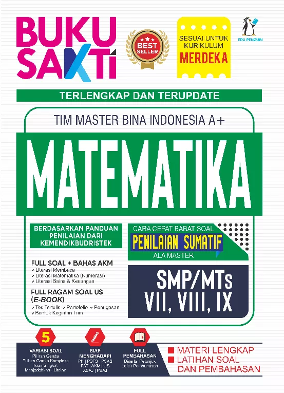 Buku ini sesuai untuk persiapan PH Penilaian Harian PSTS Penilaian Sumatif Tengah Semester PSAS Penilaian Sumatif Akhir Semester PSAT Penilaian Sumatif Akhir Tahun AN Asesmen Nasional dan US Ujian Sekolah Berisi ringkasan materi matematika SMP kelas VII VIII IX contoh soal latihan soal serta paket soal full pembahasan Memuat 5 variasi soal terbaru PG PG Kompleks Menjodohkan Isian Singkat dan Uraian serta soal soal HOTS