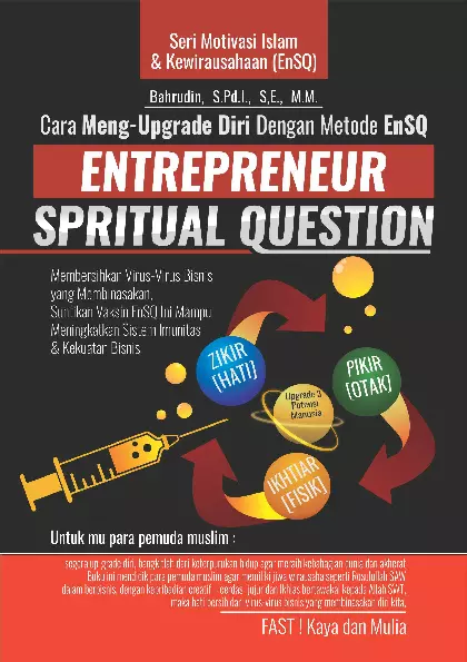 Sinopsis Buku: Cara Meng-Upgrade Diri dengan Metode EnSQ Buku ini membimbing pembaca dalam perjalanan pengembangan diri yang holistik, menggabungkan prinsip-prinsip kewirausahaan, pengembangan pribadi, dan nilai-nilai Islam. Dengan metode EnSQ (Entrepreneur Spiritual Question), buku ini memberikan panduan praktis untuk membersihkan "virus-virus bisnis" yang menghambat pertumbuhan usaha dan meningkatkan sistem imunitas serta kekuatan bisnis secara spiritual dan emosional. Penulis, Bahrudin, seorang dosen motivator dan pengembang diri islam, menyajikan materi yang didasarkan pada pengalaman pribadi, sumber-sumber Al-Qur'an dan Hadis, serta pendekatan ilmiah. Buku ini tidak hanya memberikan wawasan teoretis, tetapi juga mengajarkan cara menerapkan konsep-konsep tersebut dalam kehidupan sehari-hari, terutama dalam bisnis. Pembaca akan memperoleh ilmu pengetahuan bisnis dalam perspektif Islam, serta dilengkapi dengan pembentukan kepribadian yang berakhlak mulia, sebagaimana teladan Nabi Muhammad SAW dalam segala aspek kehidupan. Buku ini menjadi salah satu jalan untuk mendekatkan diri pada Allah SWT, meraih takwa, dan memperoleh kebahagiaan dunia dan akhirat. Dengan suntikan terapi EnSQ, pembaca dapat menjalani jihad melalui bisnis sekaligus meraih keberkahan dan keberhasilan yang sesungguhnya.