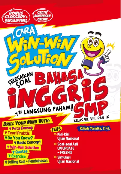 Sinopsis Buku: Cara Win-Win Solution Selesaikan Soal Bahasa Inggris SMP Kelas VII, VIII, dan IX Buku ini merupakan panduan komprehensif dan praktis yang dirancang khusus untuk membantu siswa SMP kelas VII, VIII, dan IX dalam memahami dan menguasai materi Bahasa Inggris sesuai dengan Standar Isi (Kurikulum 2013). Buku ini dilengkapi dengan berbagai topik yang relevan dengan kurikulum, seperti sapaan (greetings), perpisahan (leave taking), memperkenalkan diri dan orang lain, perintah dan respons perintah, larangan, permintaan maupun penjelasan permintaan, serta permintaan dan pemberian informasi. Selain itu, buku ini juga mencakup materi tentang percakapan telepon, teks pendek fungsional seperti pemberitahuan, kartu ucapan, pesan singkat, surat, pengumuman, undangan, iklan, dan jadwal, serta teks deskriptif, prosedural, naratif, rekam peristiwa, dan laporan. Buku ini dilengkapi dengan latihan soal dan contoh soal yang relevan dan terstruktur, sehingga memudahkan siswa dalam mempelajari dan menguasai materi Bahasa Inggris secara efektif. Dengan pendekatan Win-Win Solution, buku ini tidak hanya membantu siswa dalam memahami materi, tetapi juga mengembangkan kemampuan berkomunikasi secara efektif dan bermakna dalam bahasa Inggris. Buku ini merupakan alat bantu yang sangat berguna bagi siswa, guru, serta orang tua dalam proses belajar-mengajar Bahasa Inggris di tingkat SMP.