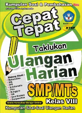 Sinopsis Buku: Buku *Cepat Tepat Taklukan Ulangan Harian SMP/MTs Kelas VIII* hadir sebagai panduan praktis dan efektif bagi para siswa kelas VIII dalam menghadapi berbagai jenis ujian harian, seperti Ulangan Harian, Ujian Tengah Semester (UTS), Ujian Akhir Semester (UAS), dan bahkan Ujian Nasional (UN). Buku ini dirancang khusus untuk membantu siswa memperkuat pemahaman materi pelajaran, meningkatkan kemampuan menganalisis soal, serta meningkatkan kepercayaan diri dalam menghadapi ujian. Buku ini terdiri dari berbagai bagian utama, yaitu: 1. Rangkuman Materi Semester 1 yang disusun secara terstruktur dan jelas, sehingga memudahkan siswa dalam memahami konsep-konsep inti pelajaran. 2. Soal Latihan Ulangan Harian yang disusun berdasarkan tingkat kesulitan, mulai dari soal-soal dasar hingga soal-soal yang lebih kompleks, untuk melatih kemampuan siswa dalam mengerjakan berbagai jenis soal. 3. Soal Latihan Ulangan Semester 1 yang membantu siswa dalam mempersiapkan diri menghadapi ujian akhir semester. 4. Buku ini mencakup berbagai mata pelajaran yang relevan dengan kurikulum SMP/MTs kelas VIII, seperti Ilmu Pengetahuan Sosial (IPS), Ilmu Pengetahuan Alam (IPA), Bahasa Indonesia, Penjasorkes, dan Seni Budaya. Dengan berbagai fitur tersebut, buku ini menjadi alat bantu belajar yang komprehensif dan mudah dipahami, sehingga dapat menjadi solusi efektif bagi siswa dalam meningkatkan hasil belajar dan kesiapan menghadapi ujian.