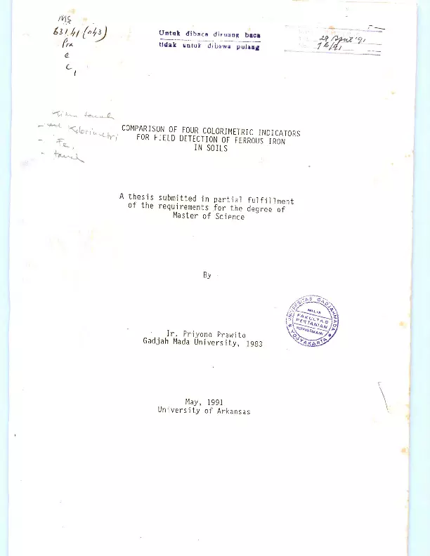 Comparison Of Four Colorimetric Indicators For Field Detection Of Ferrous Iron In Soils Ir. Priyono Prawito Fakultas Pertanian UGM Konten Lokal Konten Lokal 31097